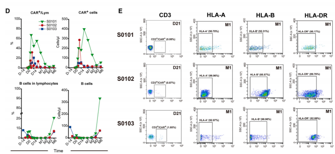 输注TyU19后,研究团队检测了患者外周血中的CAR-T与B细胞数量。输注后三名患者CAR阳性率细胞占比高,表明CAR-T细胞在体内扩增;第21天CAR-T细胞CD3-百分比分别为99.92%、99.13%和98.15%,治疗后1个月3名患者的HLA-A、HLA-B、HLA-DR的阴性率均为85%以上,表明移植物抗宿主病(GVHD)的风险小。随着CAR-T细胞扩增,B细胞数量下降,且B细胞耗竭状态维持了2~3个月,在第六个月时在S0101和S0102中观察到B细胞数量恢复,如图3所示。