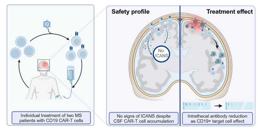 多发性硬化症(MS)是一种由异质性神经炎症和随后的神经退行性病变引起的中枢神经系统(CNS)慢性疾病,而现在的免疫调节疗法如B细胞耗竭疗法虽能有效防止复发但仍难以阻止疾病进展。而CAR-T细胞在血液恶性肿瘤领域展现了绝对的实力,于是研究者们开始验证其在自身免疫性疾病中的治疗潜力。近期研究结果显示CD19 CAR-T细胞已在系统性红斑狼疮等风湿性疾病[1,2]和重症肌无力[3]等神经免疫疾病中成功应用,这表明CD19 CAR-T也能使其他自身免疫性疾病患者获益。